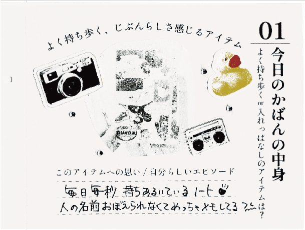 身近な持ち物を観察し、スケッチしてみます。そして、なぜそのモノを選んだのか、持ち歩くのか、モノと自分まつわるエピソードや考えを記録します。