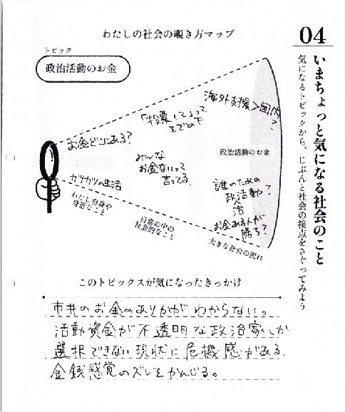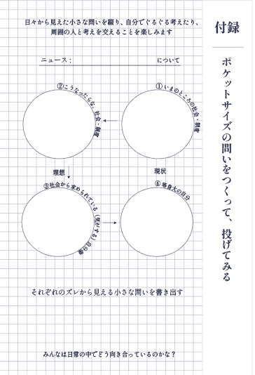 1-4枚まで個人的なことから社会的なことを振り返り、記録してもらいました。それをもとに、ふだんは言葉にしないような、小さくて大きな問いを書き出してみます。